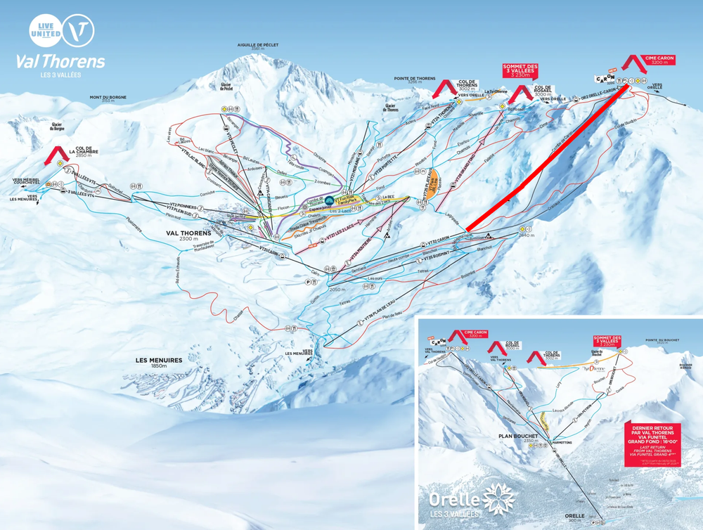 Luckily, while this cable car offered direct access to this iconic summit, it’s not the only way to reach it. Skiers can still make their way to Cime Caron via the Orelle side, though it requires a multi-lift journey, including the Orelle-Caron 10-seater gondola. Once at the top, Cime Caron serves as a critical junction, offering trails descending into both Val Thorens and Orelle and connecting the two resorts.