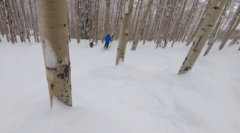 Tree runs, such as through these beautiful aspens, are higher consequence than mogul runs, as missteps can send you headfirst into an immovable tree trunk.