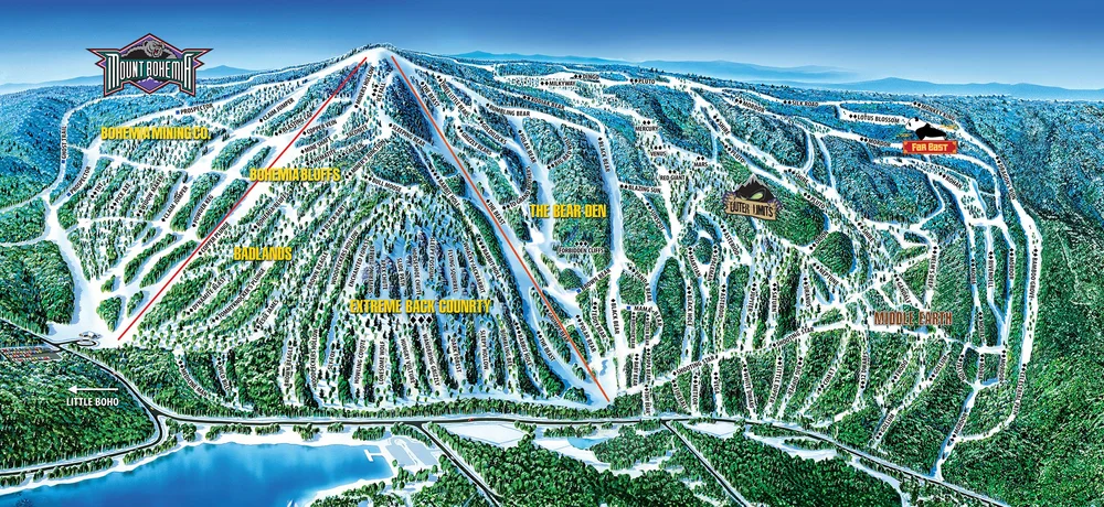 When it comes to finding your way around the mountain, you may be a bit confused your first time at Mount Bohemia. Boho has a very unique vibe in that the run names don’t matter too much, and getting lost is often a part of the experience. The trail map is also quite unhelpful, though some different maps at the base area can help clarify some navigation, though these maps are a little out of date and a few runs have been added that aren’t shown on the map. That being said, you will always end up either at a lift or the road to ride one of the aforementioned buses, so it’s tough to be in a position where you can’t get home at the end of the day. Since the buses on the road go right back to the base, you’re never more than a lift or bus ride from there.