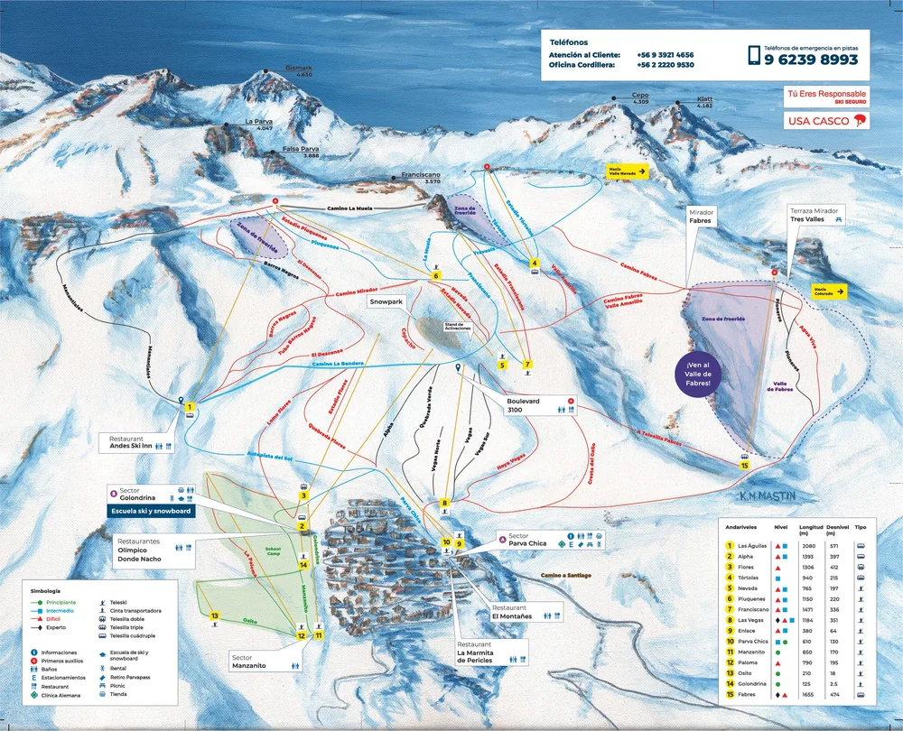 But La Parva’s strong on-mountain maintenance extends over to more than its physical skiability. The resort offers significantly better signage than most other South American ski resorts, including neighboring Valle Nevado and El Colorado, with widely-available English markings for foreigners and clear overall trail guidance. Also unlike Valle Nevado and El Colorado, La Parva has readily-available physical trail maps, which can prove very useful when you have some time to kill on the lift. If you need to speak to someone at the resort, English-speaking staff are generally available, although it does help to know some Spanish.