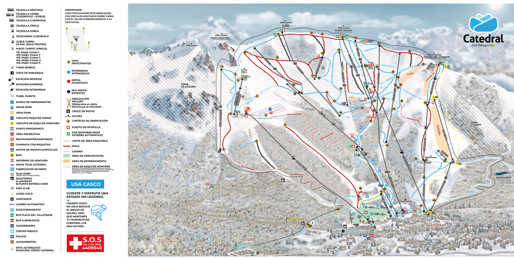 Despite its relative size for Argentina, getting around Cerro Catedral is straightforward for the most part. The resort’s signage is good by South American standards, with clear trail, lift, and restaurant markings. Color-coded boundary sticks along each marked piste help keep you in-bounds, with the colors corresponding to the trail’s ability level and helping to keep you on the appropriate level of run.